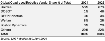 Commercial reality, however, favors quadrupeds today. SAG estimates the global quadruped market reached $350+million in revenue in 2025. Unitree held 67% of global shipments and has been profitable in its quadruped business since 2020. Boston Dynamics, though much smaller in volume, has built mature Spot deployments in oil and gas and data center environments, along with an enterprise software ecosystem and service infrastructure that remain difficult to replicate.